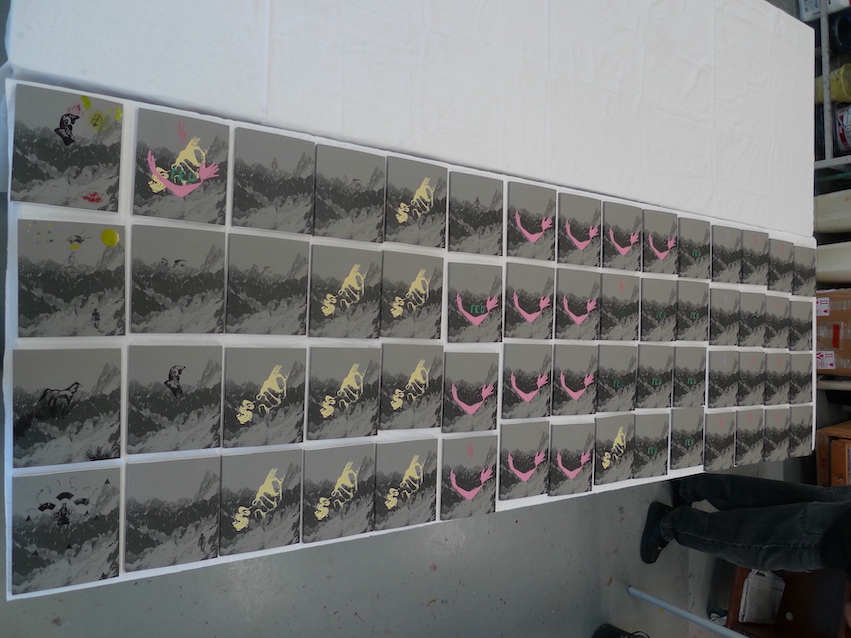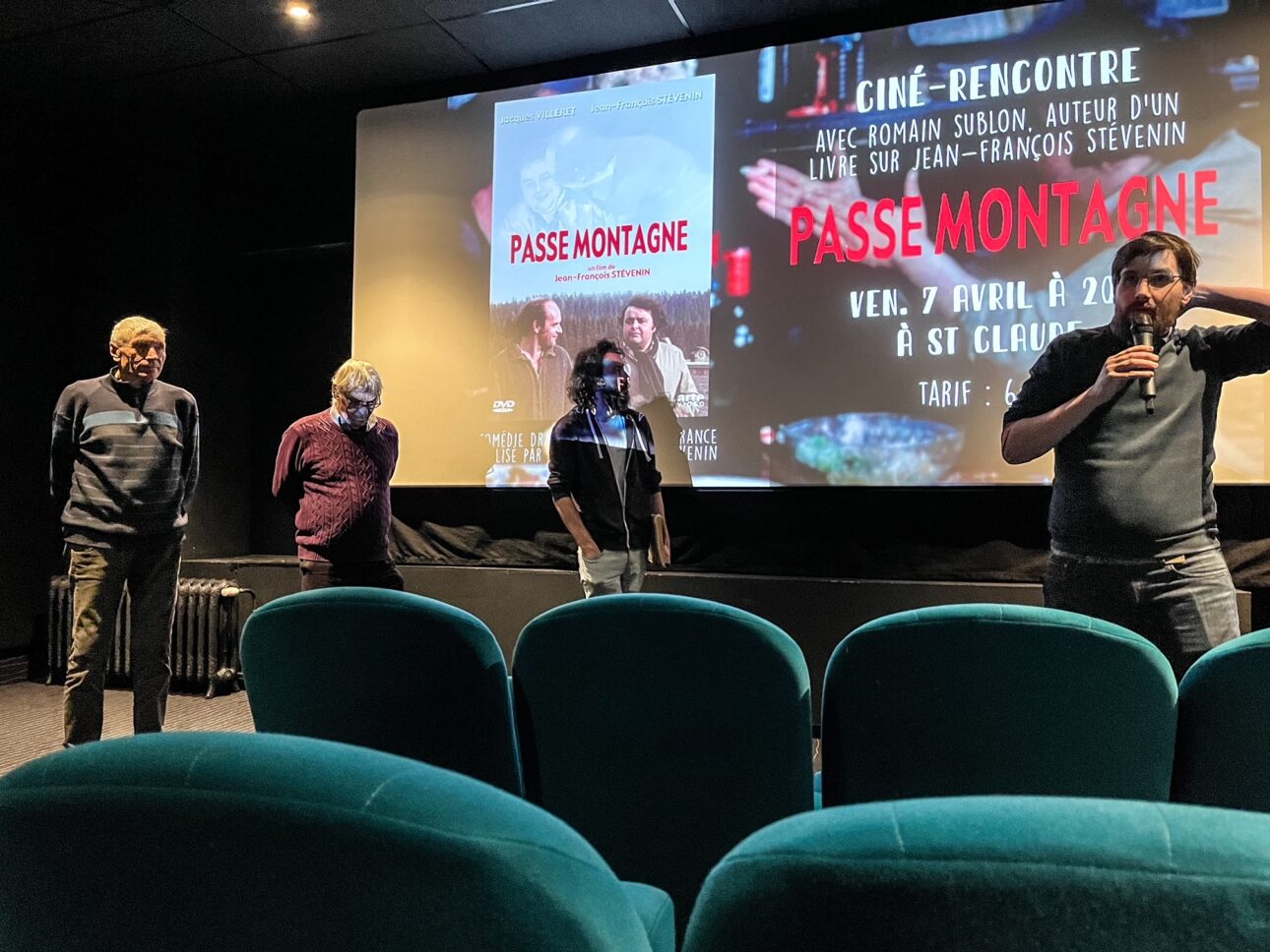 Dans l’incroyable lieu qu’est La Fraternelle (à Saint-Claude, Jura), où l’on a fabriqué la couv’ du livre, en plusieurs exemplaires presque toutes différents (tampons, sérigraphie), on a terminé notre séjour en projetant Passe-Montagne, premier film du Stévenin. Et avec nous, il y avait les Piards du film, ceux du village d’à-côté, c’était fou, c’était beau.